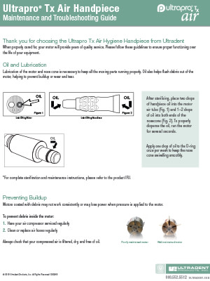 After sterilizing, place two drops of handpiece oil into the motor air tube and 1-2 drops of oil into both ends of the nose cone. To properly disperse the oil, run the motor for several seconds. Also, be sure to maintain your air compressor and keep your air lines clean to prevent dirt and debris from getting in the motor. With proper care, the Ultrapro Tx Air handpiece will provide years of quality service.