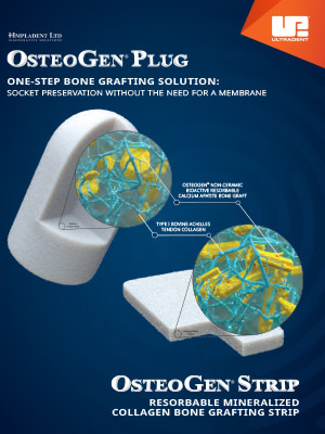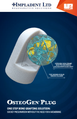 The OsteoGen® plug by Impladent® is a remarkable one-step dental bone grafting innovation. OsteoGen is physiochemically and crystallographically similar to human bone.1 It is simple to place and, unlike other grafts, with the OsteoGen® plug there is no need to cover the grafted site with a membrane after placement.